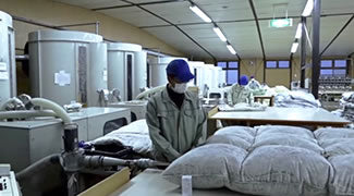 自社工場で羽毛布団から羽毛を取り出して、