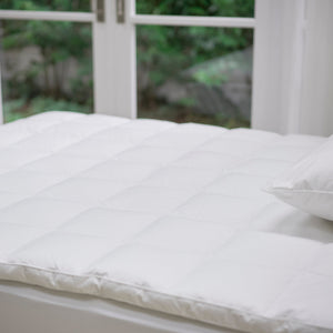 さらに、2層キルトは表と裏のがわ地の間にもう1枚シートを挟み込みます。せっかく軽い羽毛をお選びいただくのですから、余計な材料で重さを出すのはもったいないと考え、シンプルな構造だけれども、羽毛の偏りを防ぎ、本来のボリュームを引き出す立体キルトをお勧めしています。
