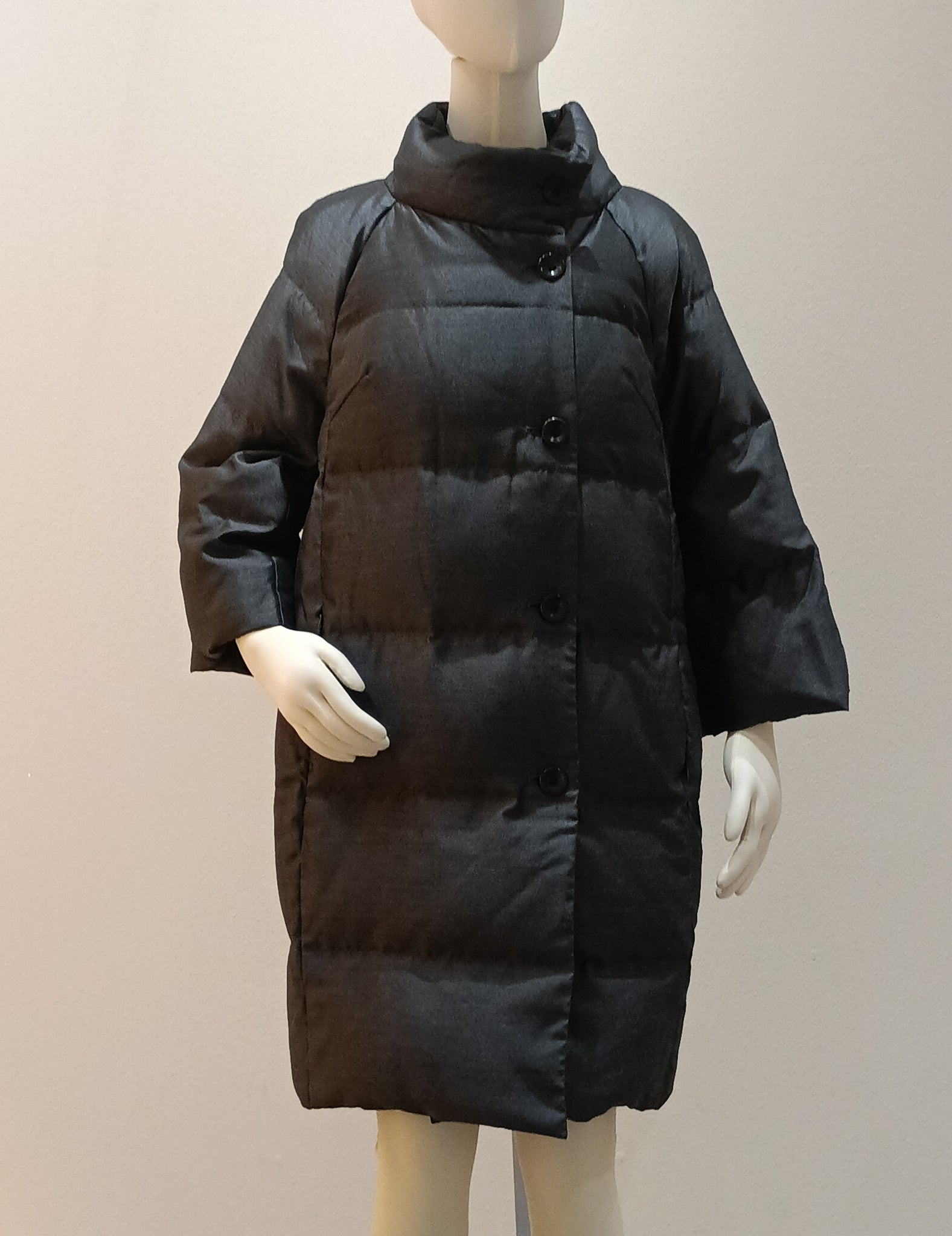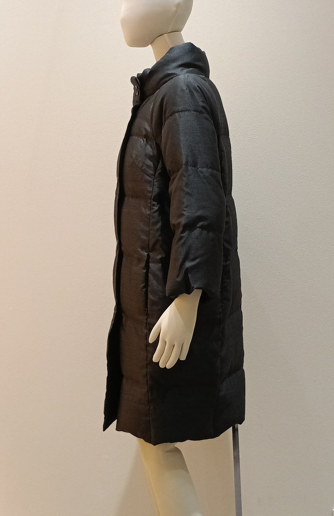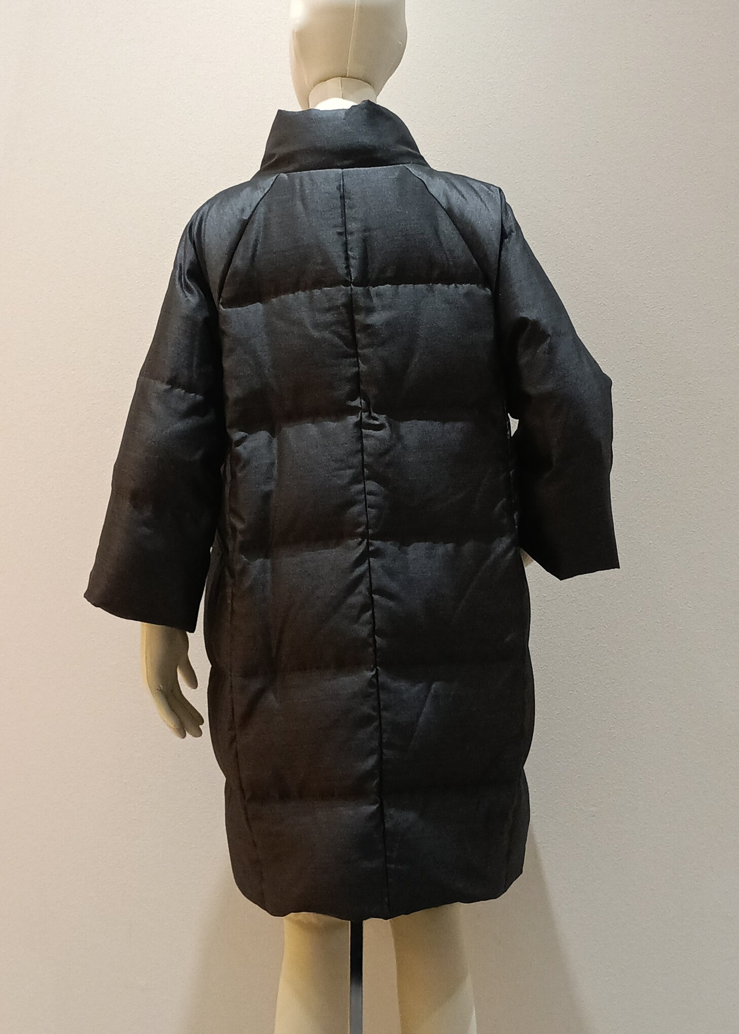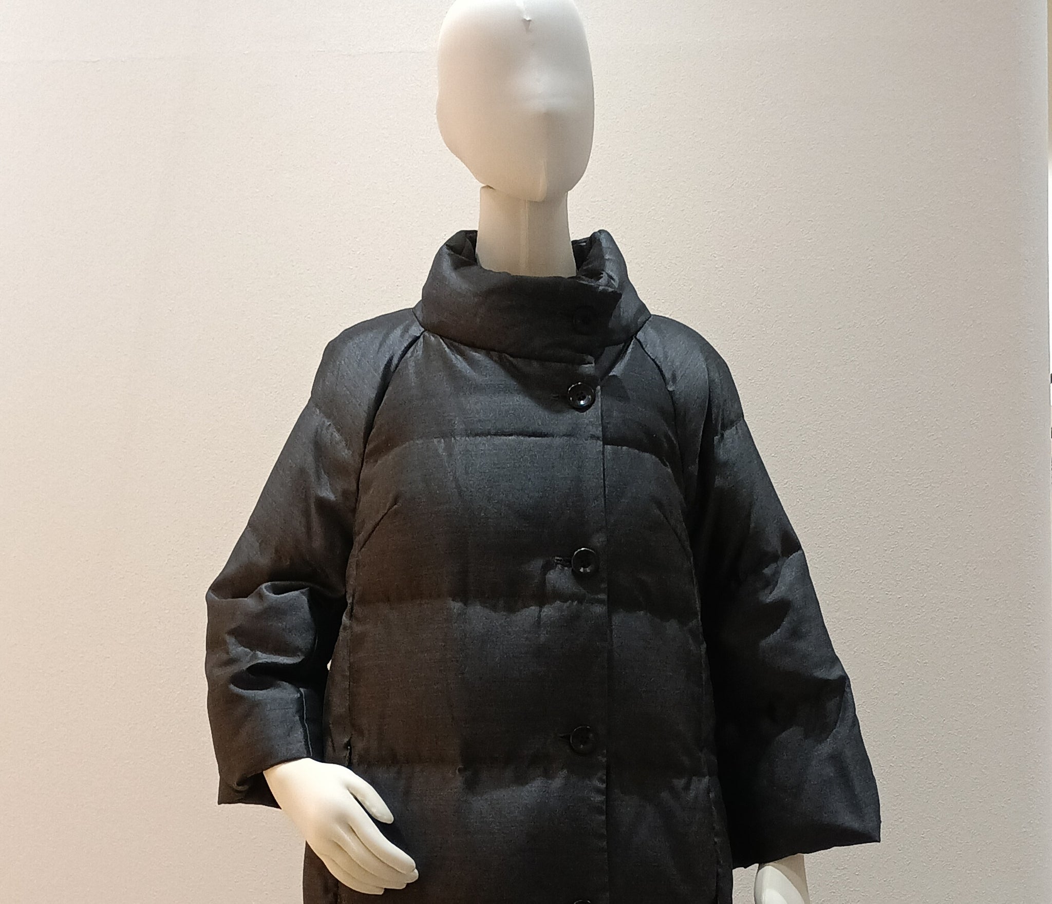 チャコールグレーのコクーンシルエットのダウンコートです。