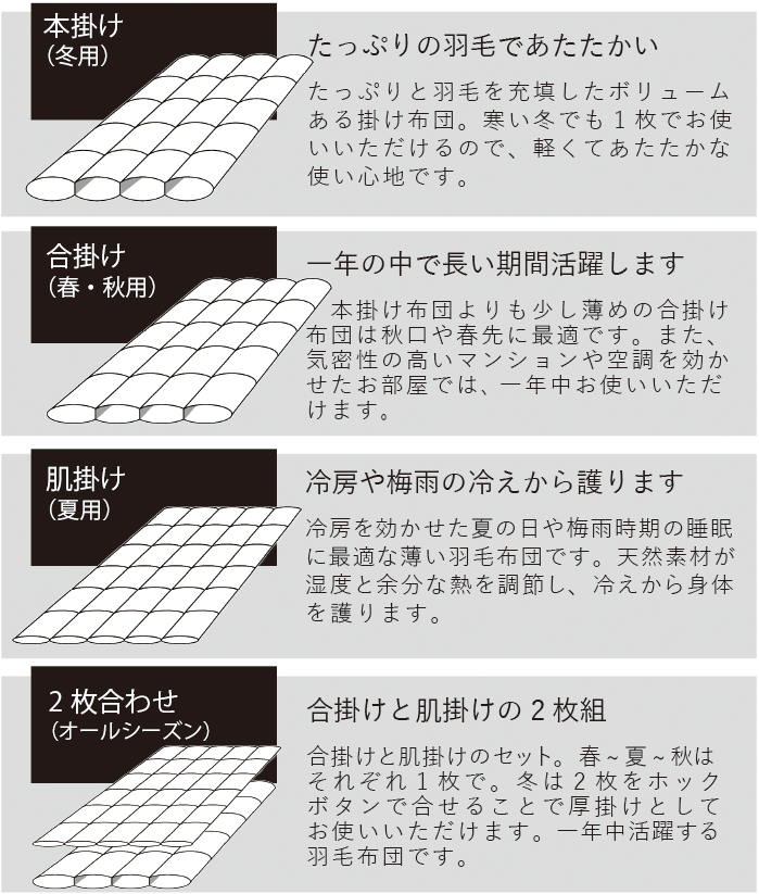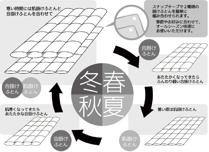 ・縫製:本掛け・合掛け=立体キルト、肌掛け=タタキキルト